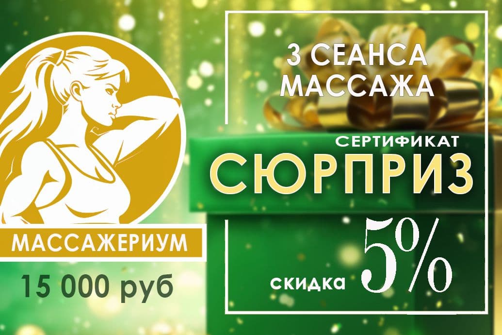 Подарочный сертификат "Сюрприз" номинальной стоимостью 16 500 руб за 15 675 руб на 3 сеанса массажа по 60 минут или на 6 сеансов по 30 минут и по сертификату можешь привести на сеанс с собой члена семьи.